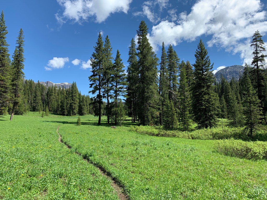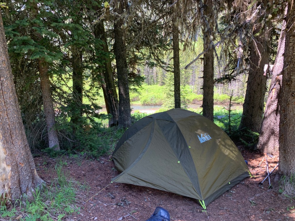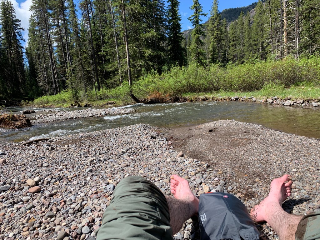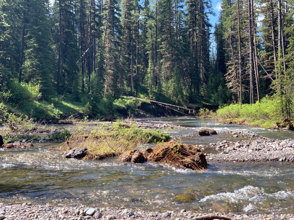 Once I was all set up, I took a walk back to the Bliss Pass trail down to the river, bear spray and tomahawk close at hand. It was a simply stunning place to camp. I spent the rest of the afternoon taking short walks around, up to the Montana border, and back and forth to the river looking for wildlife.