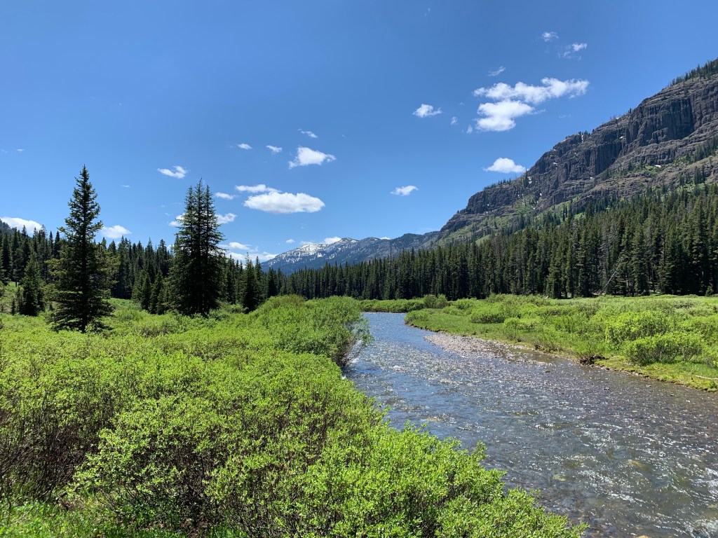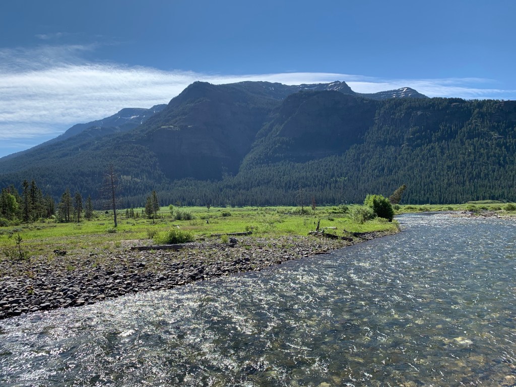 When I got back, I took the trail as a direct route to the road, and walked down the road aways back to my car. Arriving out of the wilderness to the banks of the Lamar River and being greeted by wandering bison is quite an experience. I sat alongside Pebble Creek near where it meets the Lamar River, hanging out with a large bison for a while, enjoying the view.