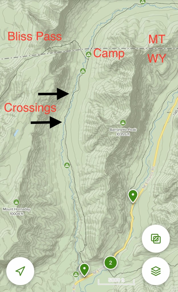 At around mile 4.5, I came to the first river crossing. The route called for crossing to the west side of Pebble Creek for only about a mile and then crossing back over before getting to the campsite. I didn’t bring any footwear other than my boots, and I planned to just cross the river barefoot. However, when I saw the river conditions, it was clear this wasn’t the run of the mill barefoot ford.